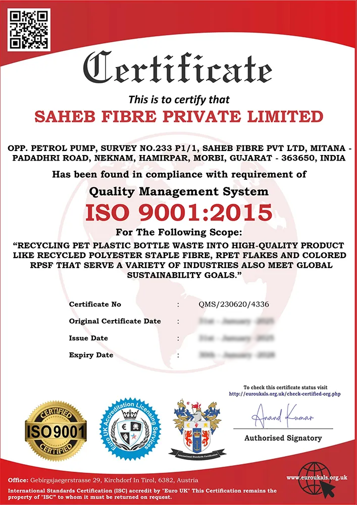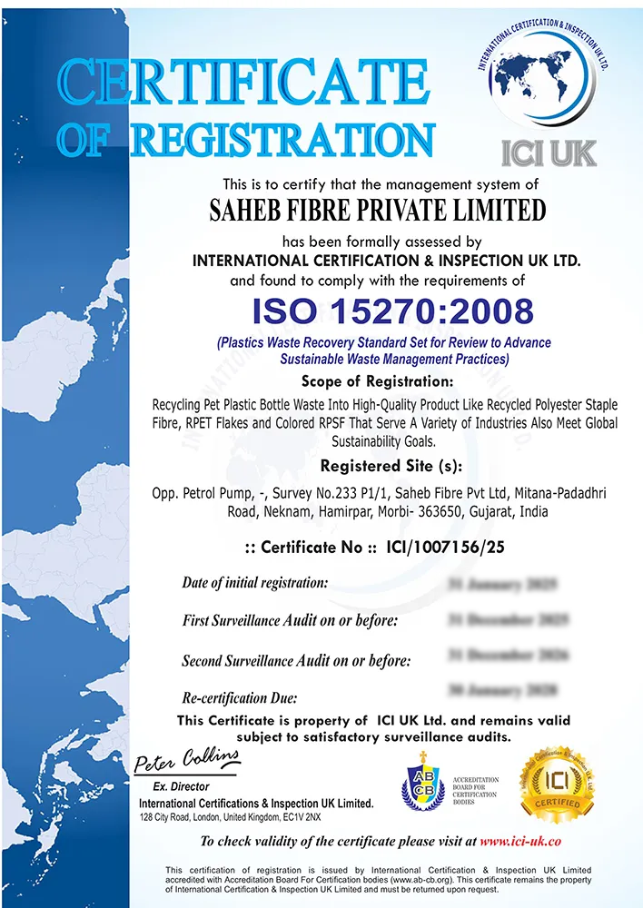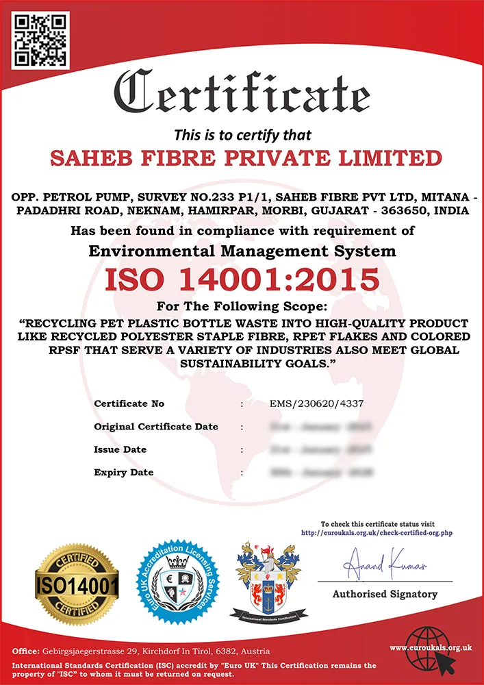 ISO 14001:2015 is an internationally accepted standard for an Environmental Management System (EMS). It provides a framework for businesses to identify, control, and improve their environmental performance. This certification shows Saheb Fibre's commitment to minimizing its environmental footprint through the responsible use of resources, minimization of plastic waste, and minimization of pollution. To maintain compliance with environmental regulations, adhering to ISO 14001:2015 allows the company to also promote a sustainable production process and enhance its role in supporting the circular economy with plastic bottle recycling.