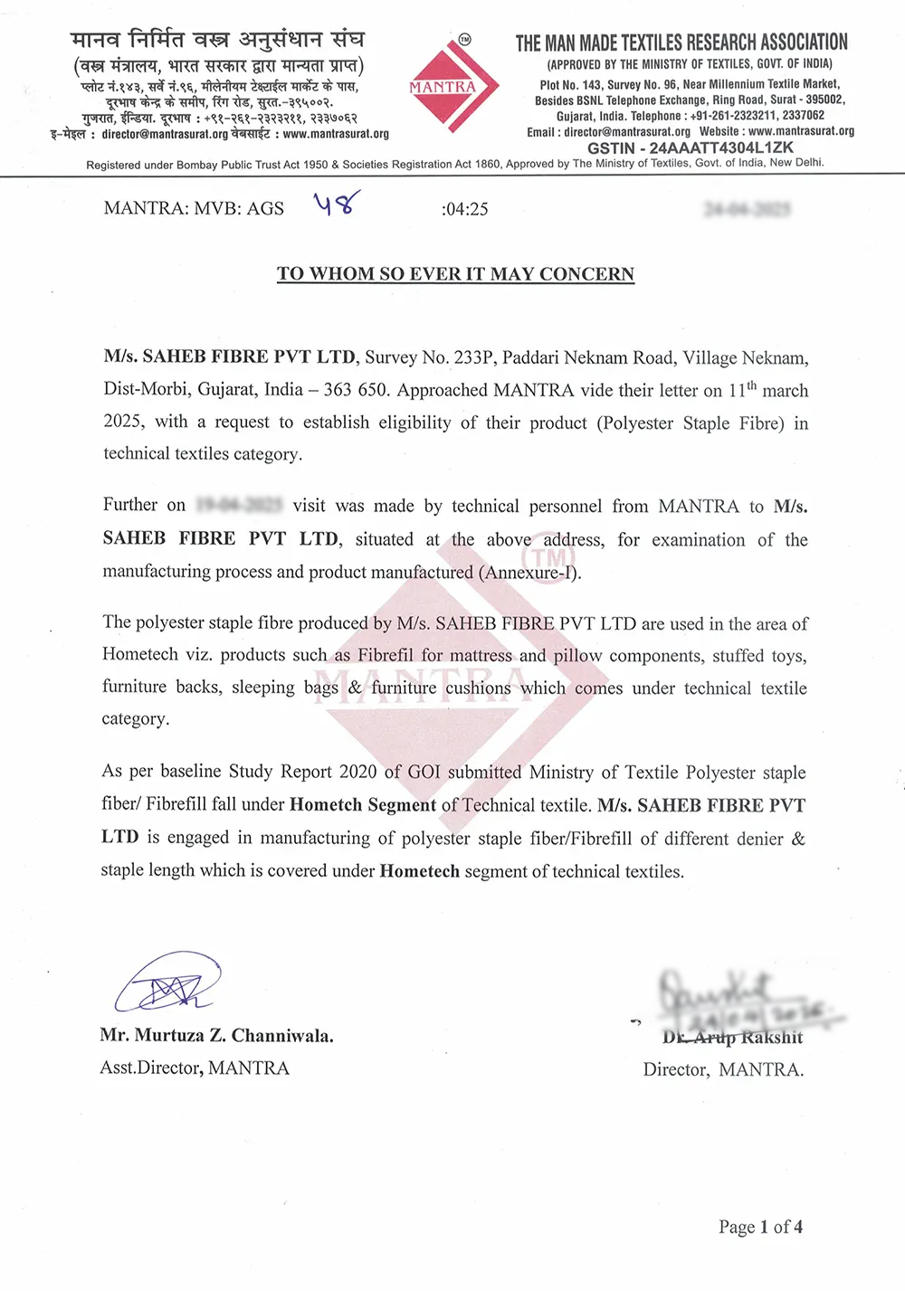 Saheb Fibre Pvt. Ltd. has been officially recognized and also certified by The Man Made Textiles Research Association (MANTRA) India. This certification confirms that Saheb Fibre’s recycled polyester staple fibre (RPSF) products meet the stringent requirements of quality, durability, suitability for use in textiles set by MANTRA. Following detailed laboratory analysis and successful evaluation of product samples, MANTRA validated that our fibre is produced in compliance with accepted textile industry norms.