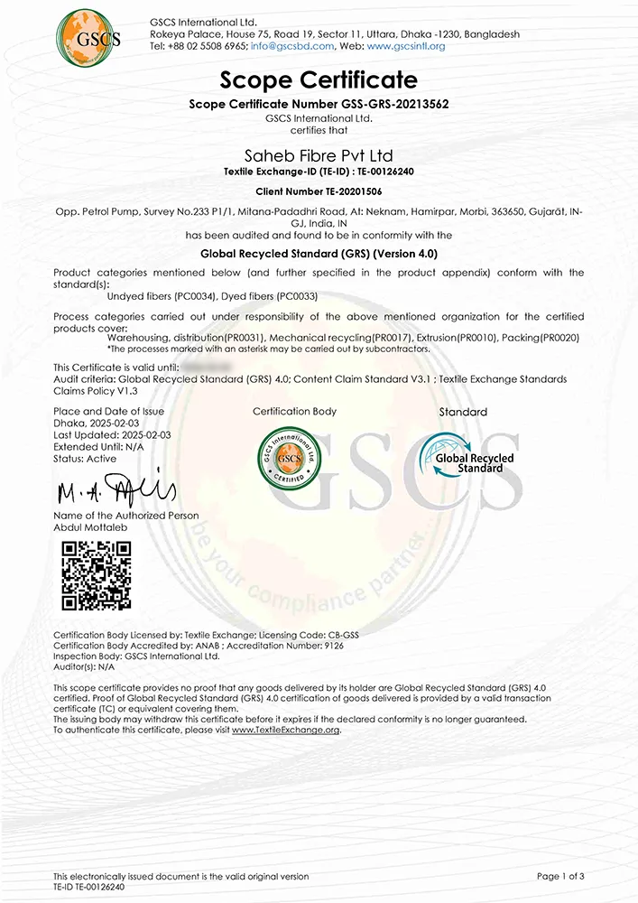 GRS Scope Certificate states the scope of products, processes, and facilities, under which the certification applies, to trace and ensure transparency from raw materials to final product. This means that the recycled content in the certified product has been verified and that the product fulfills sustainability and ethical conditions from the production period. GRS certification, Saheb Fibre Pvt. Ltd. is a company that is also dedicated to promoting sustainable practices and to the production of polyester to industries such as textiles, home furnishings, automotive, and packaging industries.