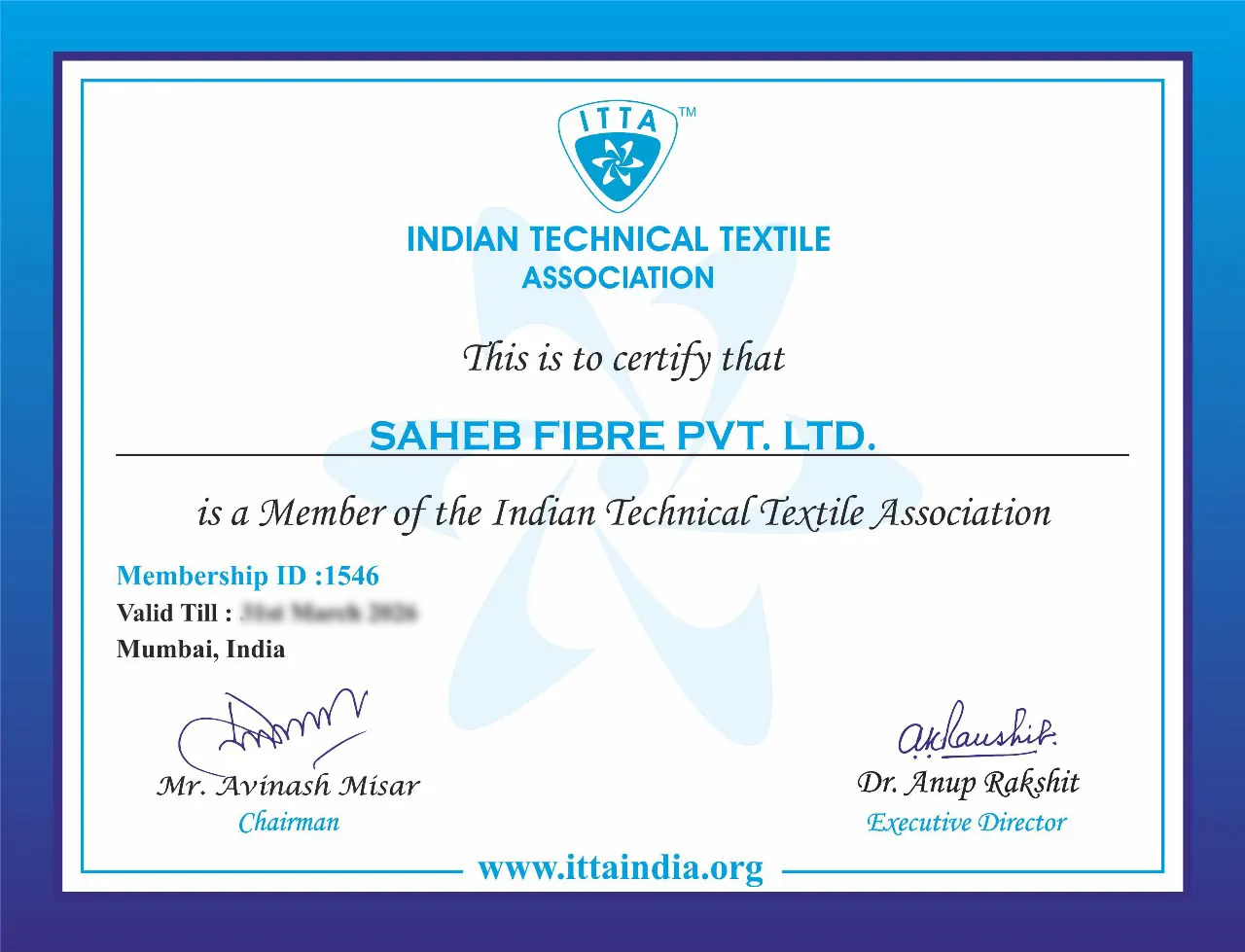 Saheb Fibre Pvt. Ltd. is a proud member of the Indian Technical Textile Association (ITTA), the premier national organization dedicated to the growth and promotion of the technical textiles sector in India. As a member of this group, we indicate our dedication to innovation, industry collaboration and excellence in fibre development and application. Saheb Fibre stands as an ITTA member, updating the trends, regulations and the latest research in technologies of technical textiles to remain ahead of the time by providing high performance, sustainable fibre solutions that meet the global markets demands.