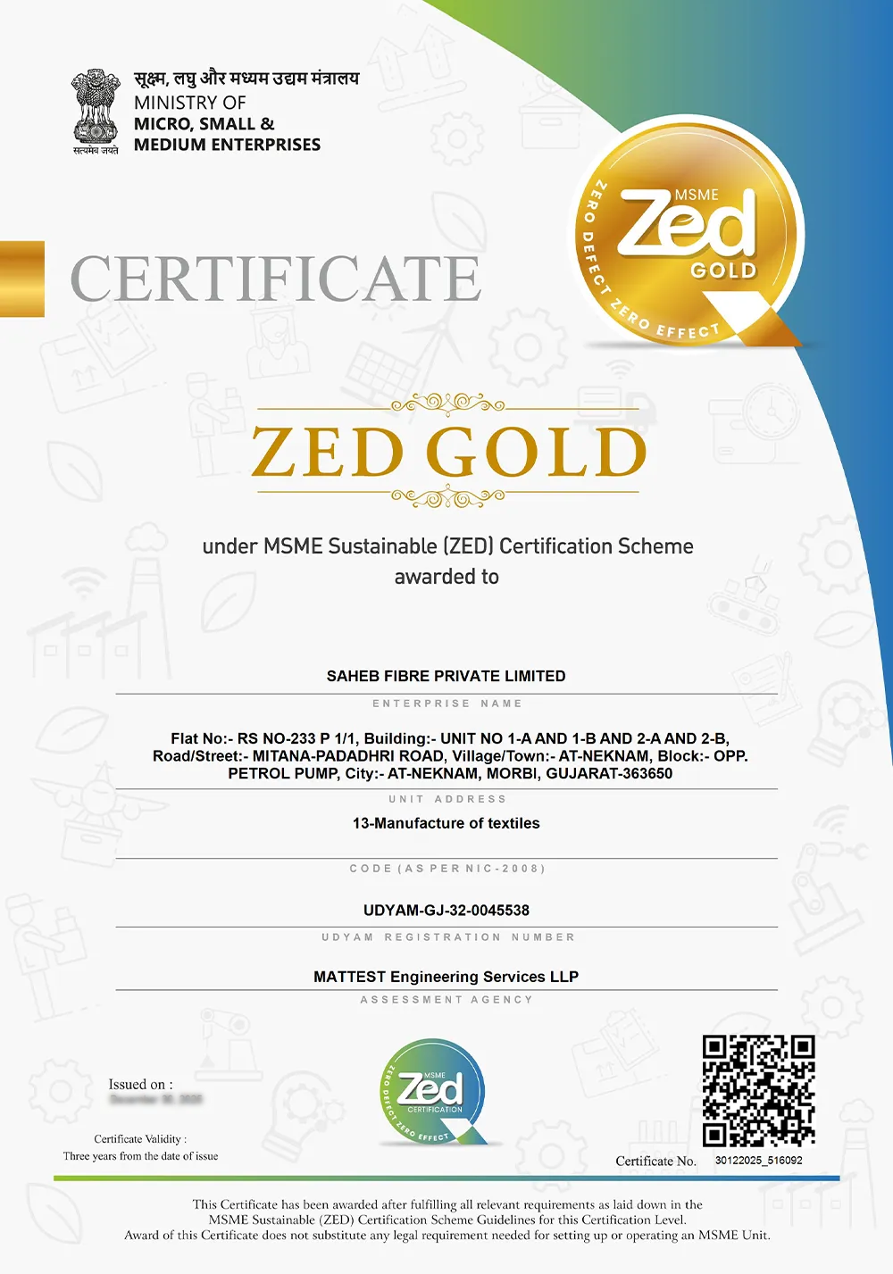 Saheb Fibre Pvt. Ltd. firmly boasts of being ZED Gold Certified, which proves that we care about producing zero-defect products and conduct business in a manner that does not harm the environment. This standard assures us of compliance with sustainable production methods, energy conservation and minimisation of waste throughout our recycled polyester fibre production. It also represents our emphasis on process excellence, regulatory compliance, and continuous improvement. ZED Gold certification enables our customers and business partners to be confident that all products we provide are of high quality, sourced responsibly, and in a way that is sustainable in the long run.